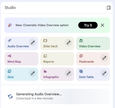 Here is the feature that surprises people most: NotebookLM can generate a full audio overview of any notebook. It creates a two-host, podcast-style conversation where AI voices discuss, summarize, and explain the documents you have uploaded, including back and forth dialogue about the most important points.